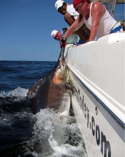 First timers to Panama…Greg and Chuck from Washington D.C. were our first guests. The first day went real well with smooth seas and clear skies for the run to Hannibal Bank. Lots of bait on the high spot and all by ourselves…first thing in the morning were the ideal conditions for a Marlin. After only about 15 minutes a big fish comes up behind the short bait and hammers the bridled Bonito. Greg handles it perfectly and lets her eat the bait for a good 5 or 6 seconds before moving the Shimano Tiagra 8/0’s lever to “strike” and reeling down hard on the fish. As soon as the line goes tight we see a big Black Marlin explode out of the water and jump wildly but directly toward the boat! To get the line tight I jam the throttles forward to pull away from the fish while Greg is reeling down hard. 20 minutes later we have the beautiful fish boat side for a tag and a photo before releasing her! On the way back in we ran across Great way to start the trip!