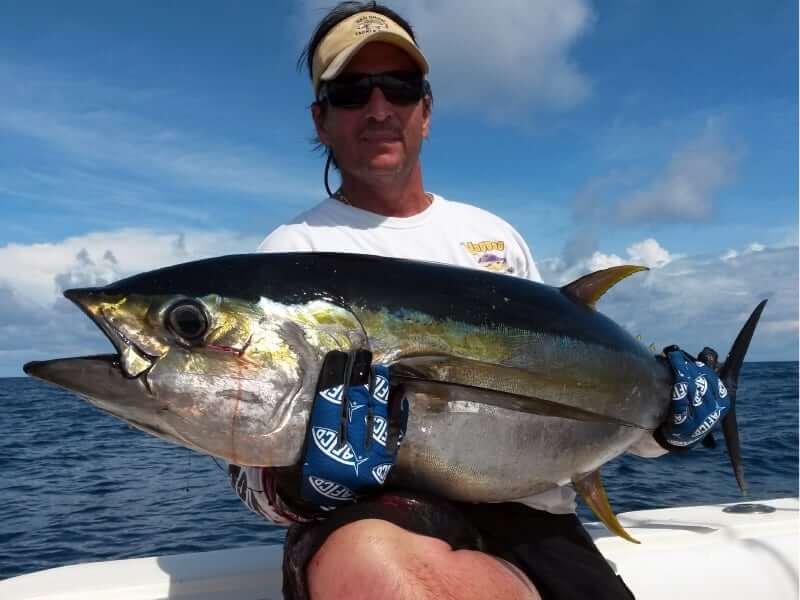 Nov 13&14/2015 Panama Fishing Report con’t – Since the last time I was there, Shane and staff have completely rebuilt the patio out of local hardwood called Neisboro, which has a beautiful finish to it. Once again upgrading the property to add to the customer experience. After gorging ourselves we headed off to bed which is another great experience, here you are in the middle of the Gulf of Chiriqui on and island and you have a hot shower, air conditioning that will freeze you if not careful with the setting and a very nice mattress to finish you off for the evening. There is nothing left out when it comes to comfort at the lodge, from the gourmet foods, to the comfortable sleeping conditions, down to the view from your cabana, it is all top notch and very well thought out. So lets get to the fishing. We fished in shore for 2 days and caught my first Rooster fish within sight of the lodge and a Rock Snapper that we had for dinner that night. After that we fished offshore for the last day and set out for Black Marlin which has been allusive to me much like the Rooster fish for so many years. After a couple of hours searching for Marlin we gave up on that and started looking for other options. About that time Shane noticed a bird pile that was showing up on his open array radar system, I know the importance of finding birds but never realized that you can find them on radar. Shane has that dialed in and we would have never found the tuna that we did without his knowledge of how to use that radar to locate birds that were 12 miles away. Once we arrived on the scene we found birds feeding over exploding yellow fin tuna, man o man what a rush that is. In very short order we are hooked up and I’m pinned to the gunnel with a ticked off 50 lb fish. Shane only uses the latest, top of the line, up to date rod and reel setups like the one I was using, Shimano everything, Terez spinning rod and a 18000 stella reel which made short order of that tuna. Next up was Shane’s manager of operations, Senor Steve, he got lucky to hook up with a 100 lber and once again with the use of their top notch equipment made short order of that fish too. At this point the tunas were still busting all around us but with 2 nice fish on board and it being 3:00 we decided to head to the hill for a comfy ride in on the Top Cat. If you haven’t fished on a World Cat you don’t know what you are missing, you can literally put a bean bag in the FRONT of the boat and take a siesta on the way in, that doesn’t happen in a mono hull for sure. Juan, Shane’s newest addition to the team, cleaned the fish with amazing to watch skill and had them on ice in no time flat. That night Chef Mark cooked them up to perfection and once again we gorged ourselves into a food coma and headed off to bed to dream about Paradise!! If you have ever considered going out of the country to fish I advise giving Sport Fish Panama Island Lodge a shot. Everything is taken care of for you, all you have to do is literally show up and enjoy your self for the duration of your stay, its that easy. So call Shane asap and get yourself booked for a trip of a lifetime. I promise you won’t find a place any better and if you do please let me know because I have got to see it. Thanks for the hospitality Shane, Steve, Juan, Mark and Burnebee (sp?) you guys have got it DIALED son!! See yall soon.”