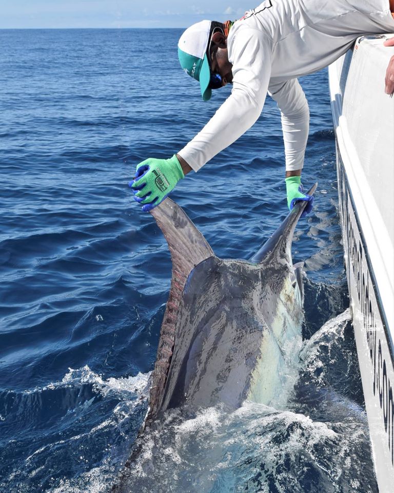 On a big fish or after a protracted battle, the crewman might begin leadering the fish as soon as he can reach the wind-on. For a marlin release to be official, the mate must touch the leader or the double line (the end of the mainline is tied into a bimini twist—the bimini twist forms a loop that connects to the loop in the wind-on leader) must touch the rod tip.