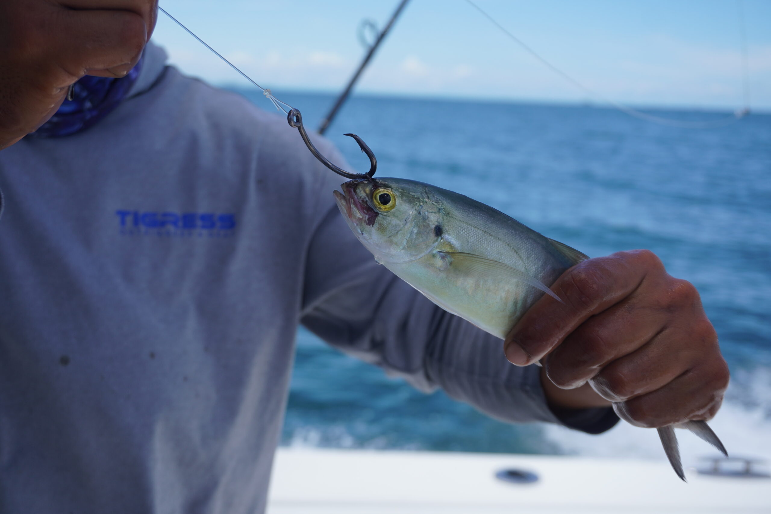 We tie a loop of wax floss onto the shaft of a circle hook. Our crew then uses an open-eyed bait needle to thread the loop over the top of the bait’s eyes. We then run the point of the hook through the loop, twist it a few times and effectively tie the runner to the hook.